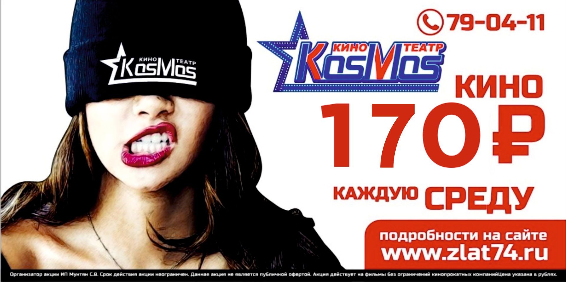 Каждую среду стоимость билета 170 рублей на все сеансы.